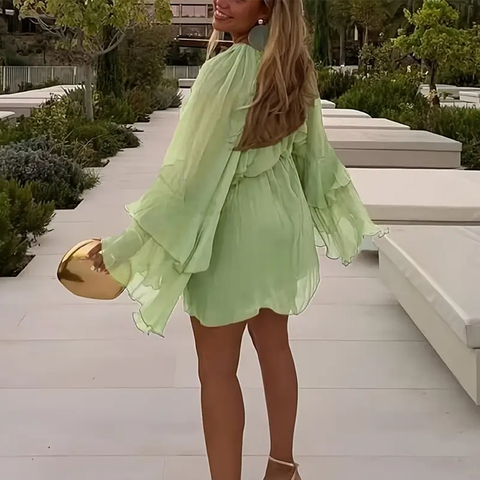 ملابس صيفية نسائية أنيقة برقبة دائرية بأكمام واسعة برباط فساتين قصيرة أنيقة جميلة
